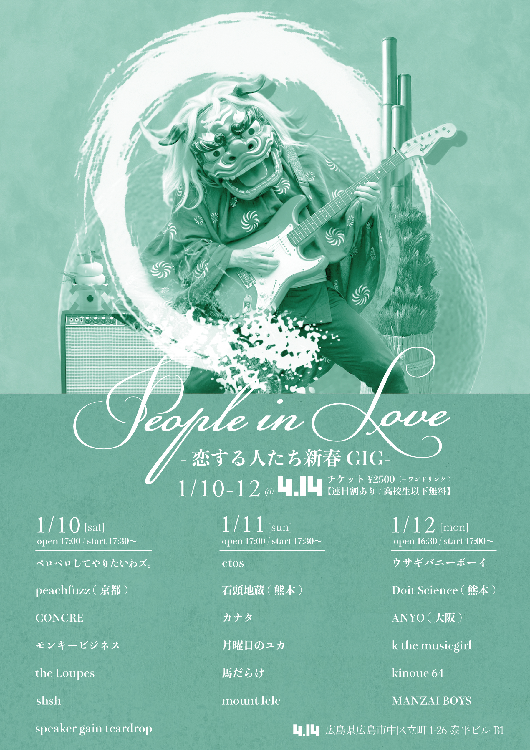 1/10~1/12の3日間に渡って行われる4.14の新春イベントに参加します。地元のバンド+県外のカッコいいバンドも交えてこのイベントの名物360°フロアライブでどの場所からでも出演バンドが見れます。お時間ありましたら是非お越しください!